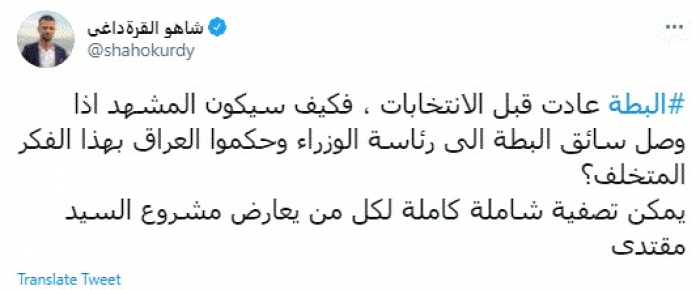 وقال في تغريدة عبر "تويتر" رصدها "المشهد العربي": "البطة عادت قبل الانتخابات، فكيف سيكون المشهد إذا وصل سائق البطة إلى رئاسة الوزراء وحكموا العراق بهذا الفكر المتخلف؟.. يمكن تصفية شاملة كاملة لكل من يعارض مشروع السيد مقتدى".
