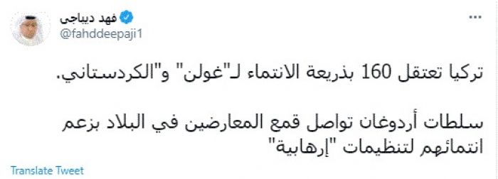 وكتب في تغريدة عبر "تويتر" رصدها "المشهد العربي": "تركيا تعتقل 160 بذريعة الانتماء لغولن والكردستاني. سلطات أردوغان تواصل قمع المعارضين في البلاد بزعم انتمائهم لتنظيمات إرهابية".