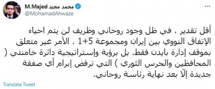وقال في تغريدة عبر "تويتر" رصدها "المشهد العربي": "أقل تقدير ، في ظل وجود روحاني وظريف لن يتم احياء الإتفاق النووي بين إيران ومجموعة 5+1 ، الأمر غير متعلق بموقف إدارة بايدن فقط، بل برؤية وإستراتيجية دائرة خامنئي (المحافظين والحرس الثوري) التي ترفض إبرام أي صفقة جديدة إلّا بعد نهاية رئاسة روحاني".