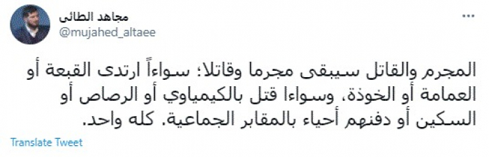 وقال في تغريدة عبر "تويتر" رصدها "المشهد العربي": "المجرم والقاتل سيبقى مجرما وقاتلا؛ سواءاً ارتدى القبعة أو العمامة أو الخوذة، وسواءا قتل بالكيمياوي أو الرصاص أو السكين أو دفنهم أحياء بالمقابر الجماعية. كله واحد".