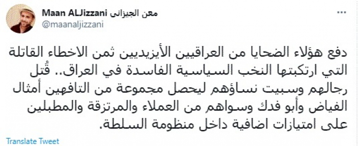وكتب في تغريدة عبر "تويتر" رصدها "المشهد العربي": "دفع هؤلاء الضحايا من العراقيين الأيزيديين ثمن الاخطاء القاتلة التي ارتكبتها النخب السياسية الفاسدة في العراق.. قُتل رجالهم وسبيت نساؤهم ليحصل مجموعة من التافهين أمثال الفياض وأبو فدك وسواهم من العملاء والمرتزقة والمطبلين على امتيازات اضافية داخل منظومة السلطة".