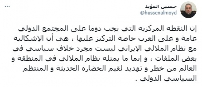 أكد الناشط السياسي حسين المؤيد أن إشكالية نظام ملالي طهران ليست على قضايا سياسية، إنما خطر على قيم الحضارة الحديثة.