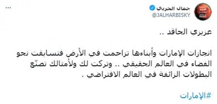 أشاد الإعلامي جمال الحربي بإنجازات دولة الإمارات العربية المتحدة، ووصولها إلى الفضاء الخارجي، بعيدا عن البطولات الزائفة.