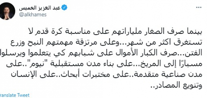وقال في تغريدة عبر "تويتر" رصدها "المشهد العربي": "بينما صرف الصغار ملياراتهم على مناسبة كرة قدم لا تستغرق اكثر من شهر...وعلى مرتزقة مهمتهم النبح وزرع الفتن...صرف الكبار الأموال على شبابهم كي يتعلموا ويرسلوا مسبارًا إلى المريخ...على بناء مدن مستقبلية نيوم..على مدن صناعية متقدمة..على مختبرات أبحاث..على الإنسان وتنويع المصادر".