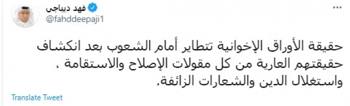 وكتب في تغريدة عبر "تويتر" رصدها "المشهد العربي": "حقيقة الأوراق الإخوانية تتطاير أمام الشعوب بعد انكشاف حقيقتهم العارية من كل مقولات الإصلاح والاستقامة ، واستغلال الدين والشعارات الزائفة".