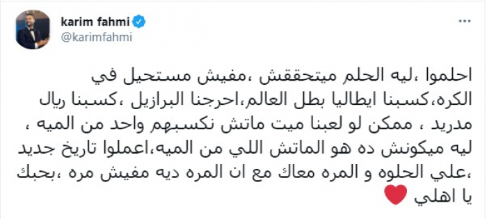 ووجه فهمي رسالة للاعبي الأهلي عبر حسابه على تويتر، قائلا: "احلموا.. ليه الحلم ميتحققش.. مفيش مستحيل في الكرة، كسبنا إيطاليا بطل العالم، احرجنا البرازيل، كسبنا ريال مدريد".
