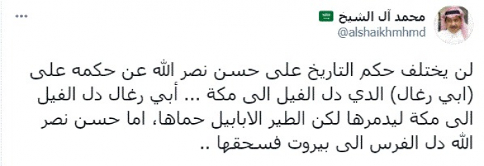 وقال في تغريدة عبر "تويتر" رصدها "المشهد العربي": "لن يختلف حكم التاريخ على حسن نصر الله عن حكمه على (ابي رغال) الدي دل الفيل إلى مكة ... أبي رغال دل الفيل إلى مكة ليدمرها لكن الطير الابابيل حماها، أما حسن نصر الله دل الفرس إلى بيروت فسحقها ".
