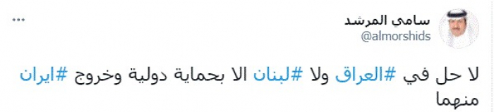 وكتب في تغريدة عبر "تويتر" رصدها "المشهد العربي": "لا حل في العراق ولا لبنان إلا بحماية دولية وخروج إيران منهما".