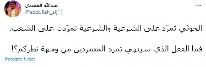 وقال في تغريدة عبر "تويتر" رصدها "المشهد العربي": "الحوثي تمرّد على الشرعية والشرعية تمرّدت على الشعب".