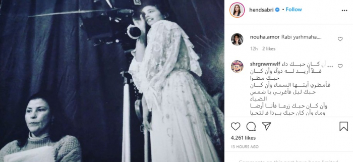 تابعت: "حضن يلمس القلب، بشهادة كل من اقترب منها أو عمل معها.. ابتسامة تخفي حزنا عميقا غامضا رغم الحمرة التي لا تفارق شفاهها.. عينان لم أرى لعمق بصيرتهما مثيلا.. صوتك وأنت تقولين لي (هندوشتي) كلما أراك أو أحدثك.. أفتقدتك وأنت حيّة، وسأفتقد جزءا من نفسي بعد رحيلك".