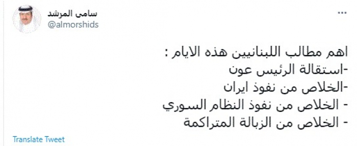 وقال في تغريدة عبر "تويتر" رصدها "المشهد العربي": "أهم مطالب اللبنانيين هذه الأيام: استقالة الرئيس عون - الخلاص من نفوذ إيران والنظام السوري والقمامة المتراكمة".