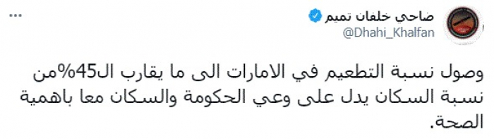 وقال في تغريدة عبر "تويتر" رصدها "المشهد العربي": "وصول نسبة التطعيم في الامارات الى ما يقارب ال45%من نسبة السكان يدل على وعي الحكومة والسكان معا بأهمية الصحة".
