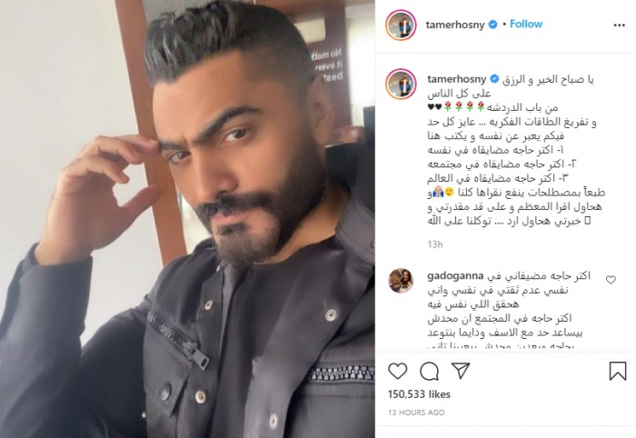 تفاعل الفنان تامر حسني مع جمهوره عبر حسابه بموقع "إنستجرام"، وطالبهم بمشاركته أكثر الأشياء التي يواجهونها وتؤثر عليهم بشكل سلبي من أجل مشاركتهم تجاربه الشخصية والتهوين عليهم.