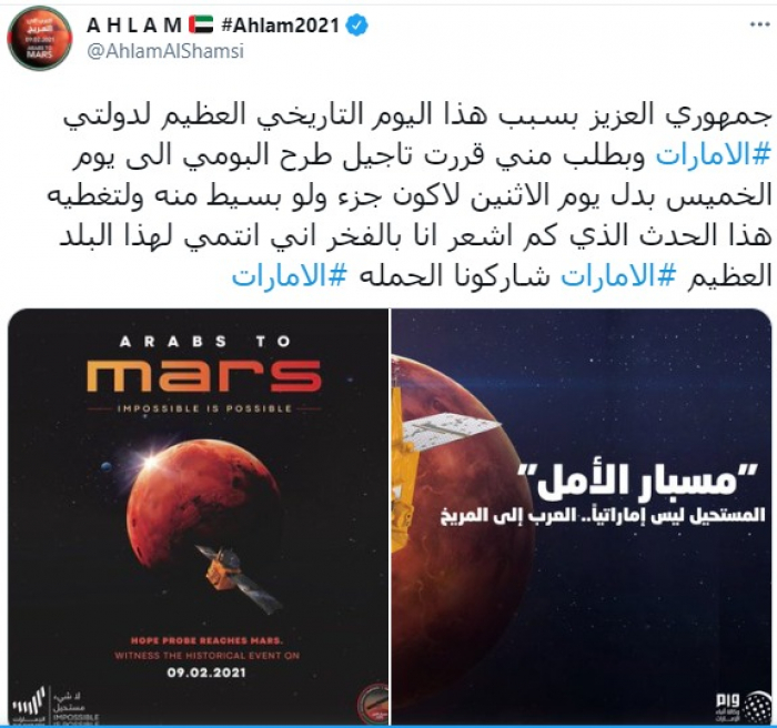 قررت المطربة الإماراتية أحلام الشامسي تأجيل طرح ألبومها الجديد "فدوة عيونك"، دعمًا لدولتها الإمارات العربية المتحدة، حيث تشهد حدثًا تاريخيًا الاثنين المقبل بوصول مسبار الأمل لمداره حول كوكب المريخ.