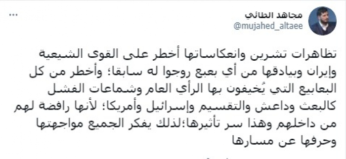 ولفت في تغريدة على حسابه بموقع التدوين المصغر تويتر، اليوم إلى أن: "تظاهرات تشرين وانعكاساتها أخطر على القوى الشيعية وإيران وبيادقها من أي بعبع روجوا له سابقا".