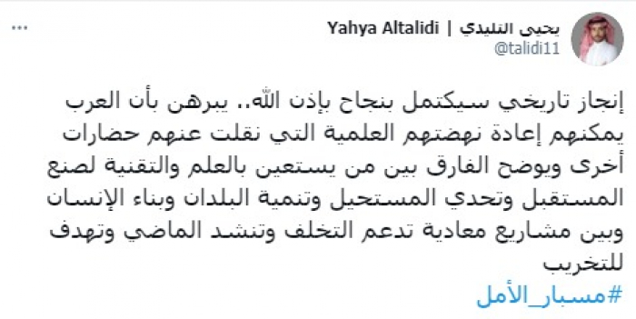 وشدد في تغريدة على حسابه بموقع التدوين المصغر تويتر، اليوم على أنه: "إنجاز تاريخي سيكتمل بنجاح بإذن الله، يبرهن بأن العرب يمكنهم إعادة نهضتهم العلمية التي نقلت عنهم حضارات أخرى".