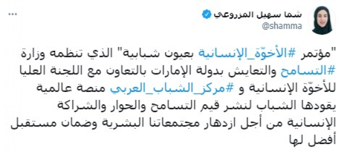 وأوضحت في تغريدة على حسابها بموقع التدوين المصغر تويتر، اليوم أن: ""مؤتمر الأخوة الإنسانية بعيون شبابية، الذي تنظمه وزارة التسامح والتعايش بدولة الإمارات بالتعاون مع اللجنة العليا للأخوّة الإنسانية ومركز الشباب العربي، منصة عالمية يقودها الشباب".