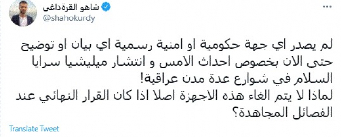 وقال في تغريدة عبر "تويتر" رصدها "المشهد العربي": "لم يصدر أي جهة حكومية أو أمنية رسمية أي بيان أو توضيح حتى الآن بخصوص أحداث الأمس وانتشار مليشيا سرايا السلام في شوارع عدة مدن عراقية".