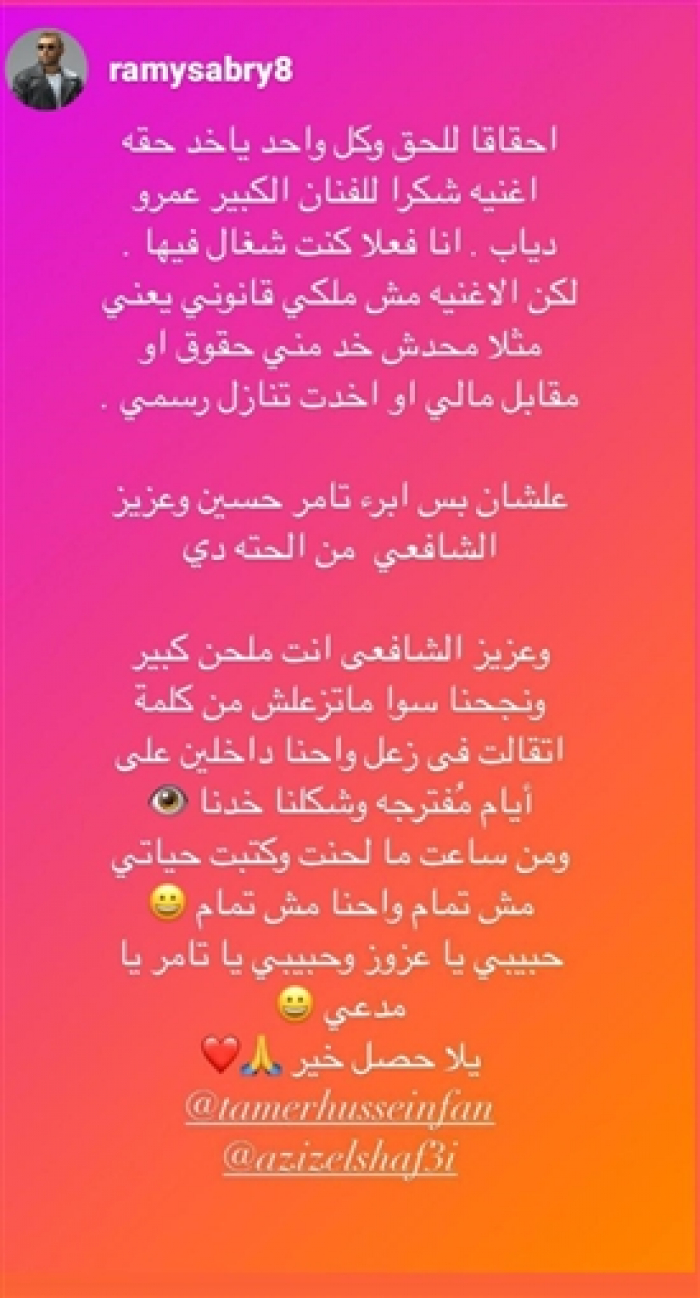 وكتب صبري، عبر "ستوري إنستجرام": "إحقاقا للحق وكل واحد ياخد حقه، أغنية (شكرا) للفنان الكبير عمرو دياب أنا فعلا كنت شغال فيها، لكن الأغنية مش ملكي قانونا، يعني مثلا محدش خد مني حقوق أو مقابل مالي أو أخدت تنازل رسمي".