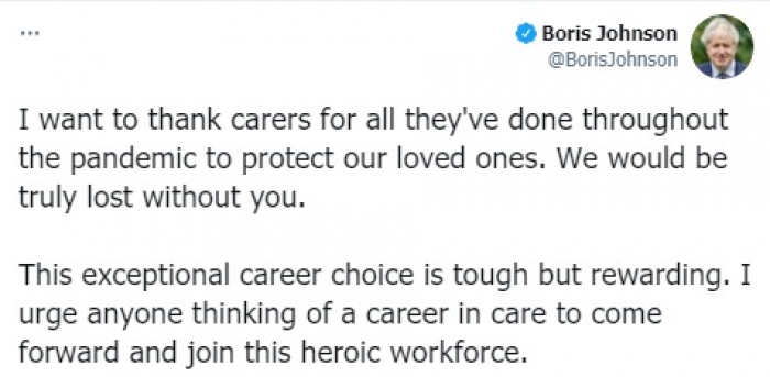 وقال في تغريدة على حسابه بموقع التدوين المصغر تويتر، اليوم إني: "أود أن أشكر مقدمي الرعاية على كل ما فعلوه طوال فترة الوباء لحماية أحبائنا"، مضيفا: "سنضيع حقا بدونكم".
