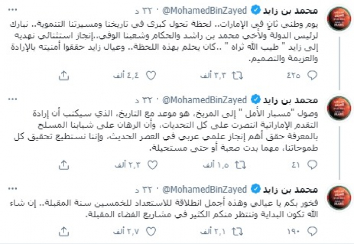 وأكد أن: "وصول "مسبار الأمل" إلى المريخ، هو موعد مع التاريخ، الذي سيكتب أن إرادة التقدم الإماراتية انتصرت على كل التحديات، وأن الرهان على شبابنا المسلح بالمعرفة حقق أهم إنجاز علمي عربي في العصر الحديث، وأننا نستطيع تحقيق كل طموحاتنا، مهما بدت صعبة أو حتى مستحيلة".