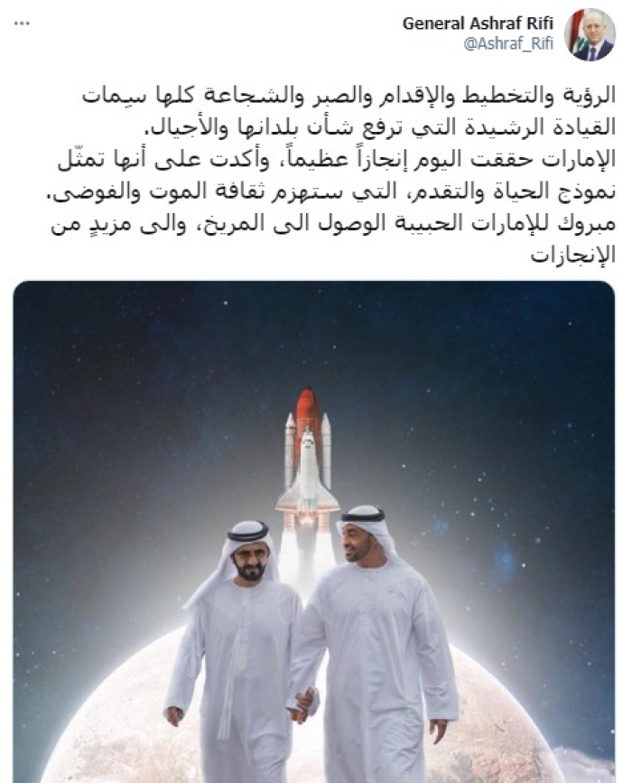وأضاف: "مبروك للإمارات الحبيبة الوصول إلى المريخ، وإلى مزيدٍ من الإنجازات"، في إشارة إلى نجاح مهمة مسبار الأمل في دخول مدار الكوكب الأحمر.