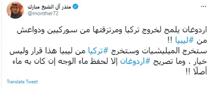 علق المدون السعودي البارز منذر آل الشيخ مبارك، على تصريحات الرئيس التركي رجب طيب أردوغان وتلميحاته بخروج مرتزقته من ليبيا.