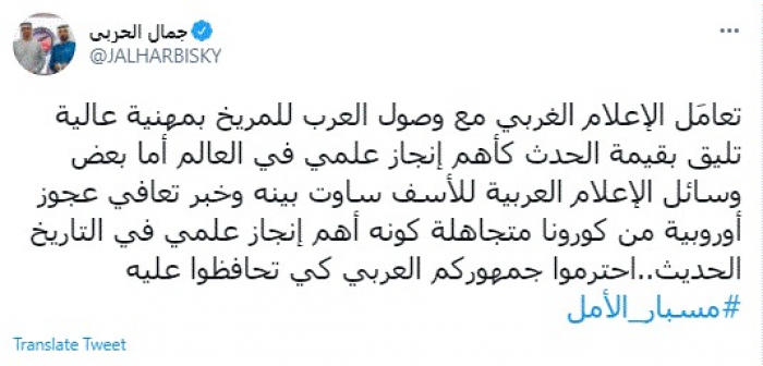 وقال في تغريدة عبر "تويتر" رصدها "المشهد العربي": "تعامَل الإعلام الغربي مع وصول العرب للمريخ بمهنية عالية تليق بقيمة الحدث كأهم إنجاز علمي في العالم".