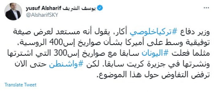 وقال في تغريدة عبر "تويتر" رصدها "المشهد العربي": "وزير دفاع تركيا خلوصي أكار، يقول أنه مستعد لعرض صيغة توفيقية وسط على أميركا بشأن صواريخ إس400 الروسية، مثلما فعلت اليونان سابقا مع صواريخ إس300 التي اشترتها ونشرتها في جزيرة كريت سابقا".