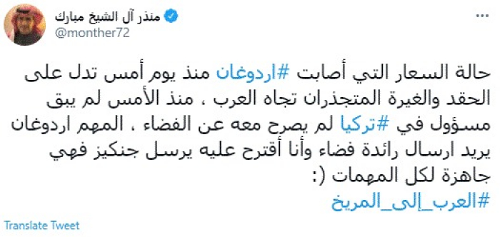 وكتب في تغريدة عبر "تويتر" رصدها "المشهد العربي": "حالة السعار التي أصابت أردوغان منذ يوم أمس تدل على الحقد والغيرة المتجذران تجاه العرب، منذ الأمس لم يبق مسؤول في تركيا لم يصرح معه عن الفضاء، المهم أردوغان يريد إرسال رائدة فضاء وأنا أقترح عليه يرسل جنكيز فهي جاهزة لكل المهمات".
