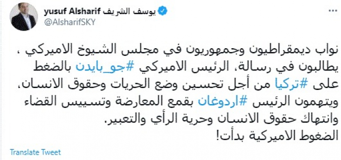 وكتب في تغريدة عبر "تويتر" رصدها "المشهد العربي": "نواب ديمقراطيون وجمهوريون في مجلس الشيوخ الأميركي، يطالبون في رسالة، الرئيس الأميركي جو بايدن بالضغط على تركيا من أجل تحسين وضع الحريات وحقوق الإنسان".