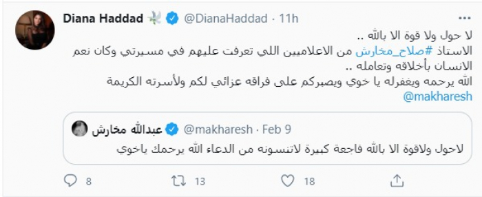كتبت ديانا تغريدة، عبر حسابها بموقع "تويتر"، :"لاحول ولاقوة إلا بالله، الأستاذ صلاح مخارش من الإعلاميين اللي تعرفت عليهم في مسيرتي وكان نعم الإنسان بأخلاقه وتعامله".