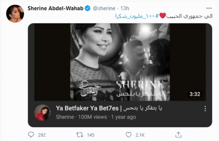 وجهت الفنانة شيرين عبد الوهاب الشكر لجمهورها، بعد أن حققت أغنية "يا بتفكر يا بتحس"، تتر مسلسل "خمسة ونص" 100 مليون مشاهدة على موقع "يوتيوب".