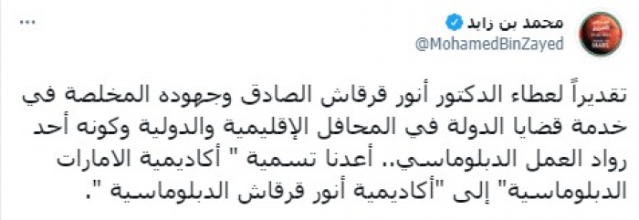 وقال في تغريدة على حسابه بموقع التدوين المصغر تويتر، اليوم إنه: "تقديرا لعطاء الدكتور أنور قرقاش الصادق وجهوده المخلصة في خدمة قضايا الدولة في المحافل الإقليمية والدولية وكونه أحد رواد العمل الدبلوماسي، أعدنا تسمية " أكاديمية الإمارات الدبلوماسية" إلى "أكاديمية أنور قرقاش الدبلوماسية".