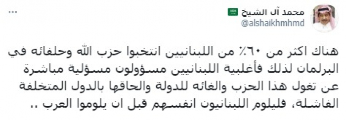 وأوضح في تغريدة على حسابه بموقع التدوين المصغر تويتر، اليوم أن: "هناك أكثر من 60٪ من اللبنانيين انتخبوا حزب الله وحلفائه في البرلمان".