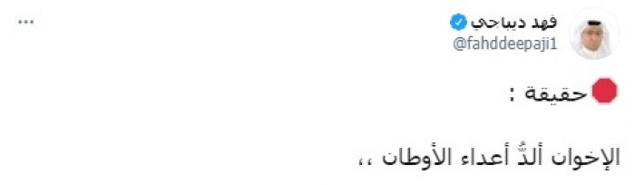 وشدد في تغريدة على حسابه بموقع التدوين المصغر تويتر، اليوم على أنه: "حقيقة: الإخوان ألدُّ أعداء الأوطان".