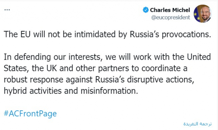 وقال ميشيل في تغريدة نشرها عبر حسابه الشخصي بـ"تويتر": "لن تخيف الاستفزازات الروسية الاتحاد الأوروبي".