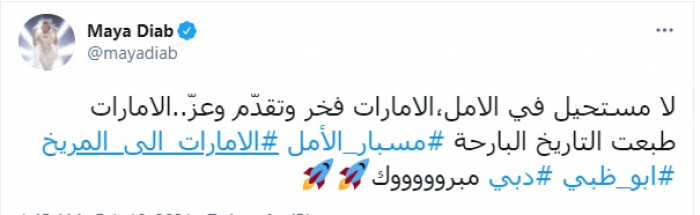 كتبت مايا تغريدة، عبر حسابها الرسمي بموقع "تويتر"،:"لا مستحيل في الأمل، الإمارات فخر وتقدم وعز، الإمارات طبعت التاريخ البارحة، مسبار الأمل، الإمارات إلى المريخ، مبروك".