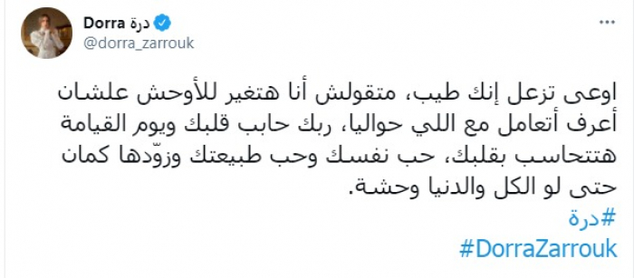 وكتبت "درة" عبر حسابها على تويتر: "أوعى تزعل إنك طيب، متقولش أنا هتغير للأوحش علشان أعرف أتعامل مع اللي حواليا.. ربك حابب قلبك ويوم القيامة هتتحاسب بقلبك.. حب نفسك وحب طبيعتك وزوّدها كمان حتى لو الكل والدنيا وحشة".