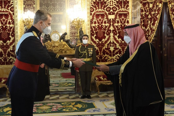 تسلم ملك إسبانيا فيليبي السادس، أوراق اعتماد السفير السعودي عزام القين كسفيرا للمملكة، وأعرب الملك عن تقديره لخادم الحرمين وولي العهد وتمنياته للسعودية وشعبها مزيداً من التقدم والرخاء.