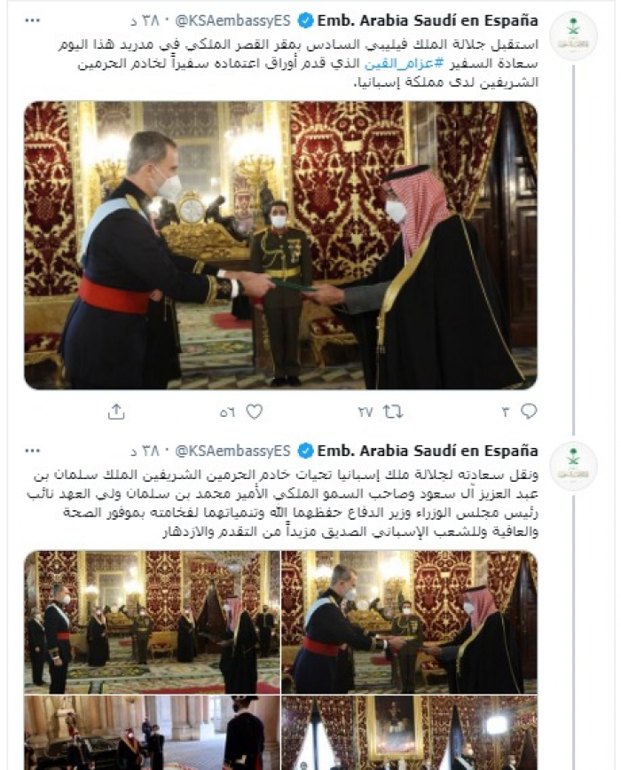 وكتب حساب السفارة السعودية في إسبانيا، عبر تغريدات رصدها المشهد العربي: " استقبل جلالة الملك فيليبي السادس بمقر القصر الملكي في مدريد هذا اليوم سعادة السفير عزام القين الذي قدم أوراق اعتماده سفيراً لخادم الحرمين الشريفين لدى مملكة إسبانيا".