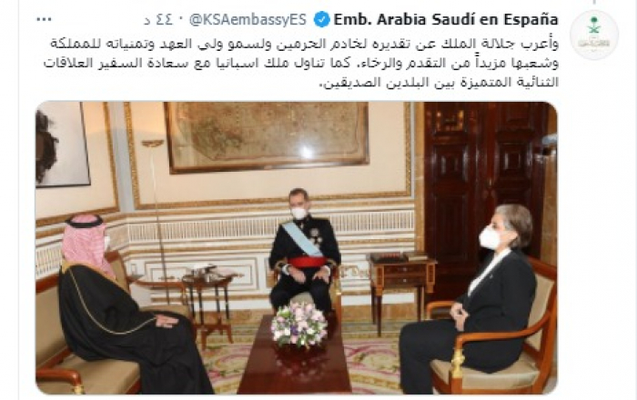 وأضافت السفارة السعودية بإسبانيا: "نقل سعادته لجلالة ملك إسبانيا تحيات خادم الحرمين الشريفين الملك سلمان بن عبد العزيز آل سعود وصاحب السمو الملكي الأمير محمد بن سلمان ولي العهد نائب رئيس مجلس الوزراء وزير الدفاع حفظهما الله وتنمياتهما لفخامته بموفور الصحة والعافية وللشعب الإسباني الصديق مزيدا من التقدم والازدهار".