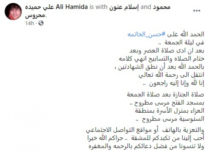 وأضاف: "نظرًا للظروف التي نعاني منها بسبب انتشار فيروس كورونا، قررت الأسرة أن يكون العزاء على المقابر عقب انتهاء مراسم الدفن، اليوم الجمعة".