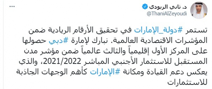 وقال في تغريدة عبر "تويتر" رصدها "المشهد العربي": "تستمر دولة الإمارات في تحقيق الأرقام الريادية ضمن المؤشرات الاقتصادية العالمية. نبارك لإمارة دبي حصولها على المركز الأول إقليمياً والثالث عالمياً ضمن مؤشر مدن المستقبل للاستثمار الأجنبي المباشر 2021/2022، والذي يعكس دعم القيادة ومكانة الإمارات كأهم الوجهات الجاذبة للاستثمارات".