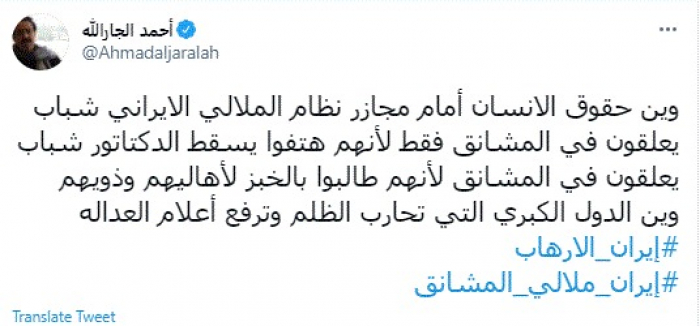 وقال في تغريدة عبر "تويتر" رصدها "المشهد العربي": "وين حقوق الإنسان أمام مجازر نظام الملالي الإيراني شباب يعلقون في المشانق فقط لأنهم هتفوا يسقط الدكتاتور شباب يعلقون في المشانق لأنهم طالبوا بالخبز لأهاليهم وذويهم وين الدول الكبري التي تحارب الظلم وترفع أعلام العدالة".
