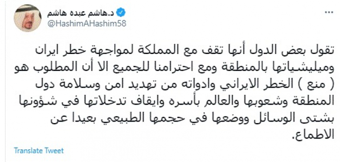وقال في تغريدة عبر "تويتر" رصدها "المشهد العربي": "تقول بعض الدول أنها تقف مع المملكة لمواجهة خطر إيران ويليشياتها بالمنطقة ومع احترامنا للجميع إلا أن المطلوب هو (منع) الخطر الإيراني وأدواته من تهديد أمن وسلامة دول المنطقة وشعوبها والعالم بأسره وايقاف تدخلاتها في شؤونها بشتى الوسائل ووضعها في حجمها الطبيعي بعيدا عن الأطماع".