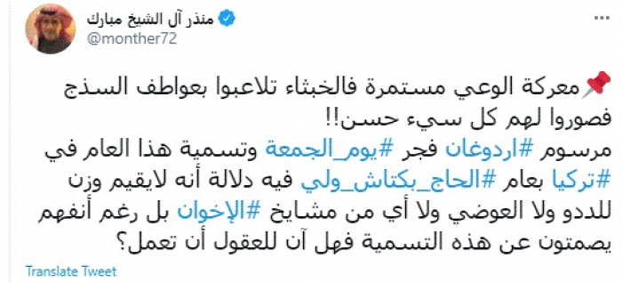 كشف المدون السعودي البارز منذر آل الشيخ، اليوم، تفاصيل خطورة مرسوم رئاسي أصدره الرئيس التركي رجب طيب أردوغان، عبر تسمية هذا العام في بلاده بعام الحاج بكتاش ولي.
