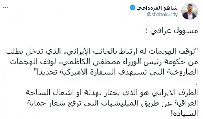 وقال في تغريدة عبر "تويتر" رصدها "المشهد العربي": "مسؤول عراقي: توقف الهجمات له ارتباط بالجانب الإيراني، الذي تدخل بطلب من حكومة رئيس الوزراء مصطفى الكاظمي، لوقف الهجمات الصاروخية التي تستهدف السفارة الأمريكية تحديدا الطرف الإيراني هو الذي يختار تهدئة أو إشعال الساحة العراقية عن طريق الميليشيات التي ترفع شعار حماية السيادة".