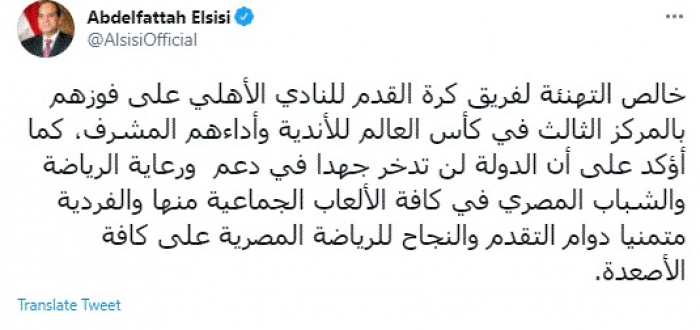 وقال في تغريدة عبر "تويتر" رصدها "المشهد العربي": "خالص التهنئة لفريق كرة القدم للنادي الأهلي على فوزهم بالمركز الثالث في كأس العالم للأندية وأداءهم المشرف".