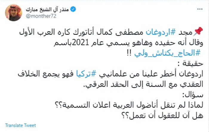 وقال في تغريدة عبر "تويتر" رصدها "المشهد العربي": "مجد أردوغان مصطفى كمال أتاتورك كاره العرب الأول وقال أنه حفيده وها هو يسمي عام 2021باسم الحاج بكتاش ولي".